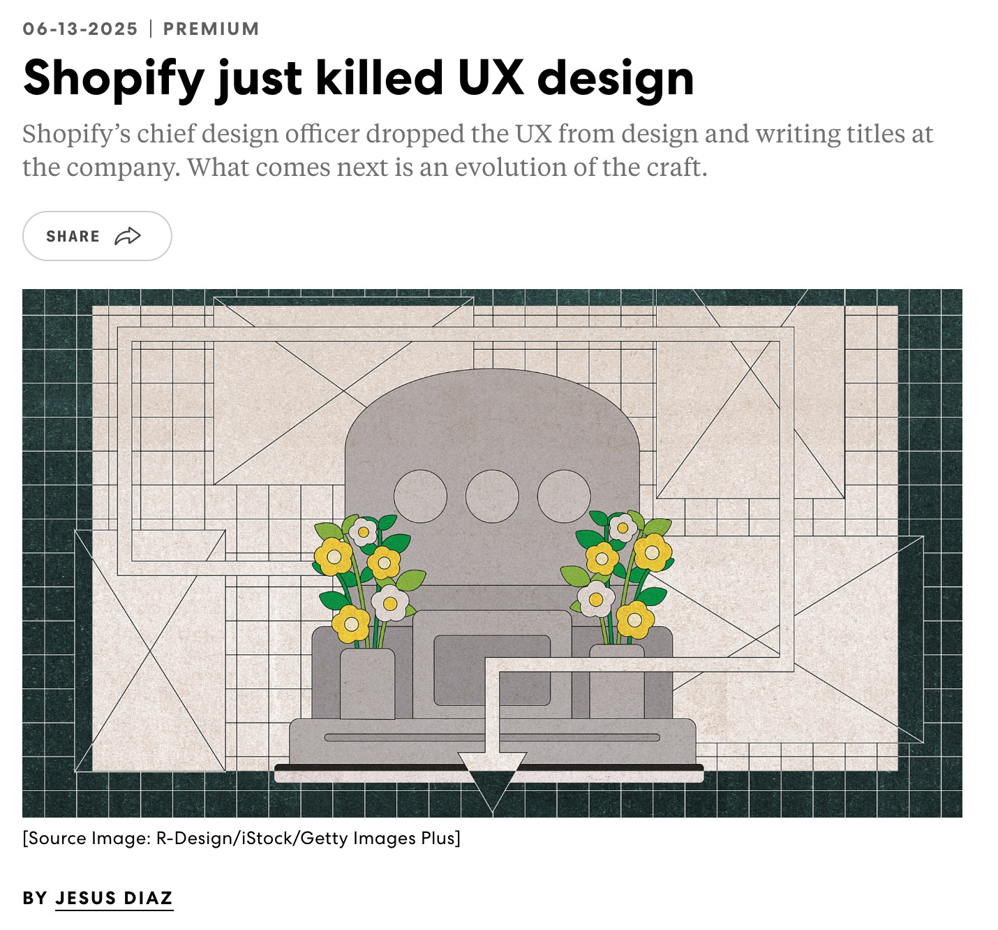 Alex 的心之所以會被刺痛,是因為他花了二十年職涯所打造的一切,正在被貼上「非必要」的標籤。最近,一則來自 Fast Company 的報導,標題是《Shopify just killed UX design》,像墓碑一樣立在他手機螢幕上。
