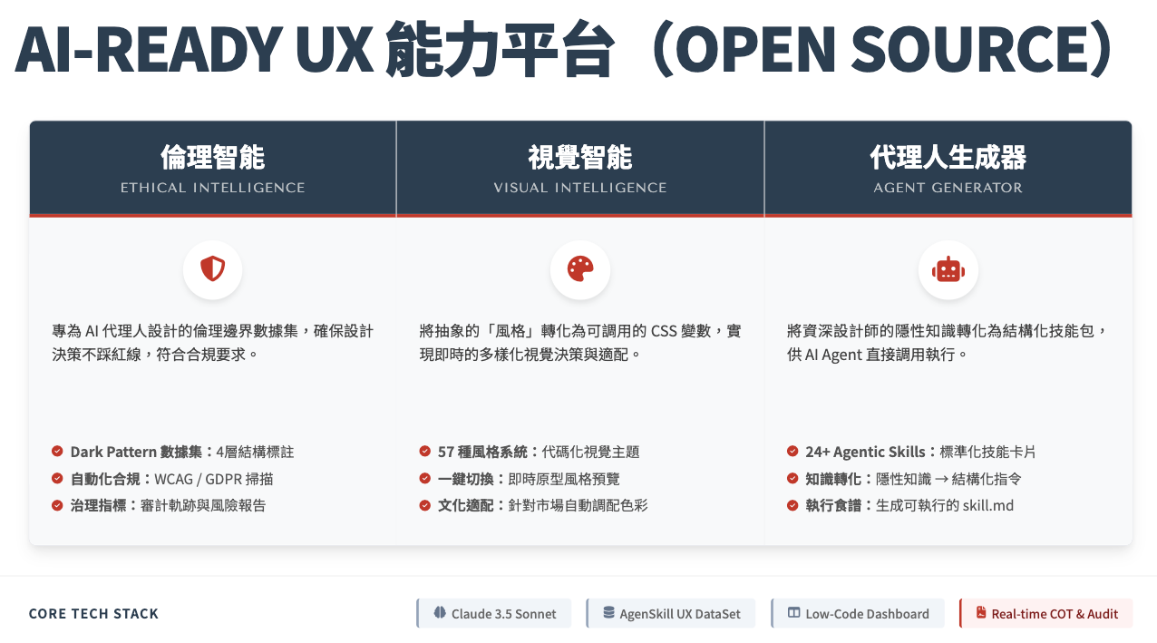 後端:Claude + AgenSkill UX DataSet(開源知識庫),包含 57 種風格代碼與 4 層倫理標註數據。